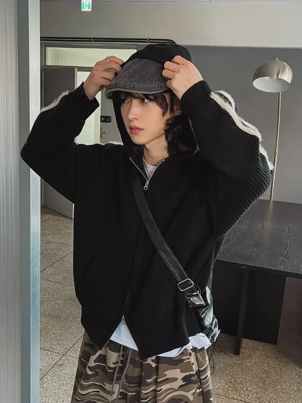 2025年シーズントレンドとなっているスポーツMIXスタイルが1枚でキマるのが、2PLAN(ツープラン)のホイヘアトラックフードニットジップアップ。ジャージ風のデザインをニットで再現している個性的なアイテムです。