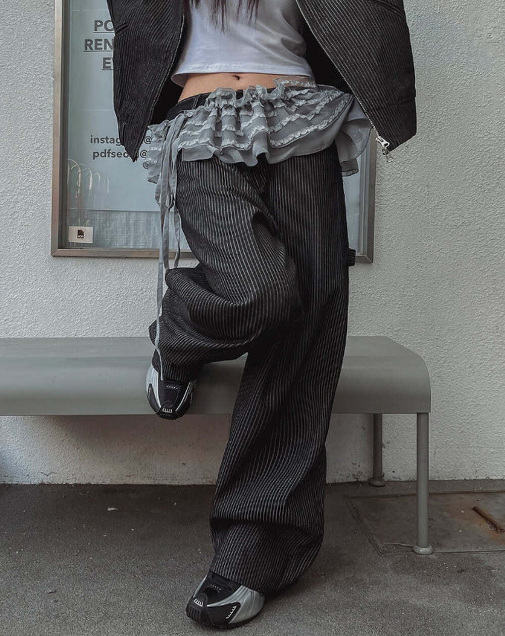 こちらのコーデで着用しているのは、ULAN(ユーラン)のレースティアードレイヤーラップベルトスカート。ベルト感覚で着用できるので、デニムやカーゴパンツとレイヤードすることで、一気にトレンドライクな印象に仕上がります。