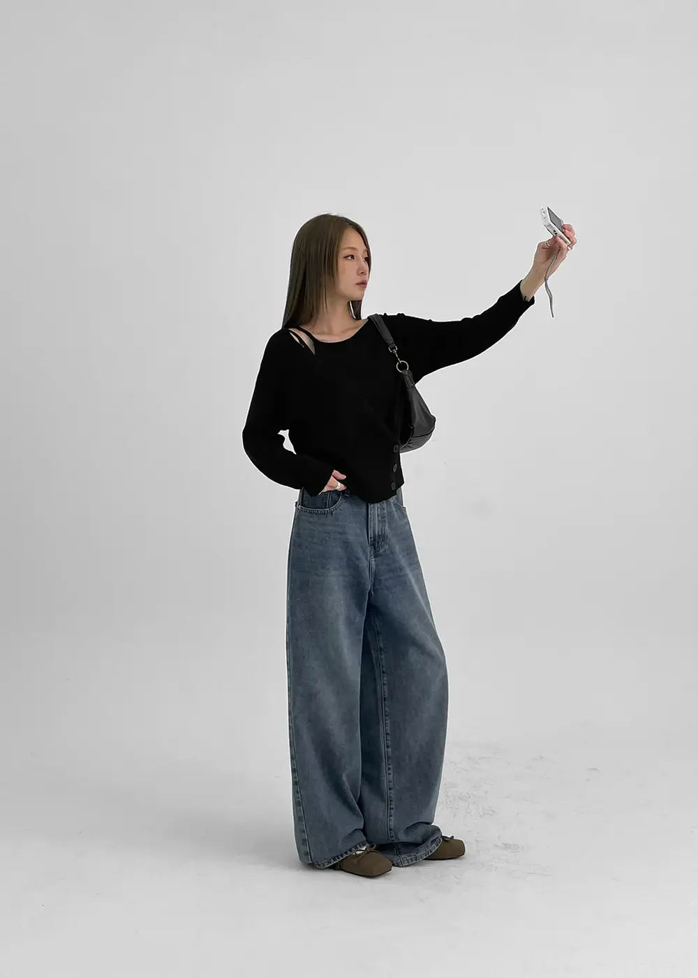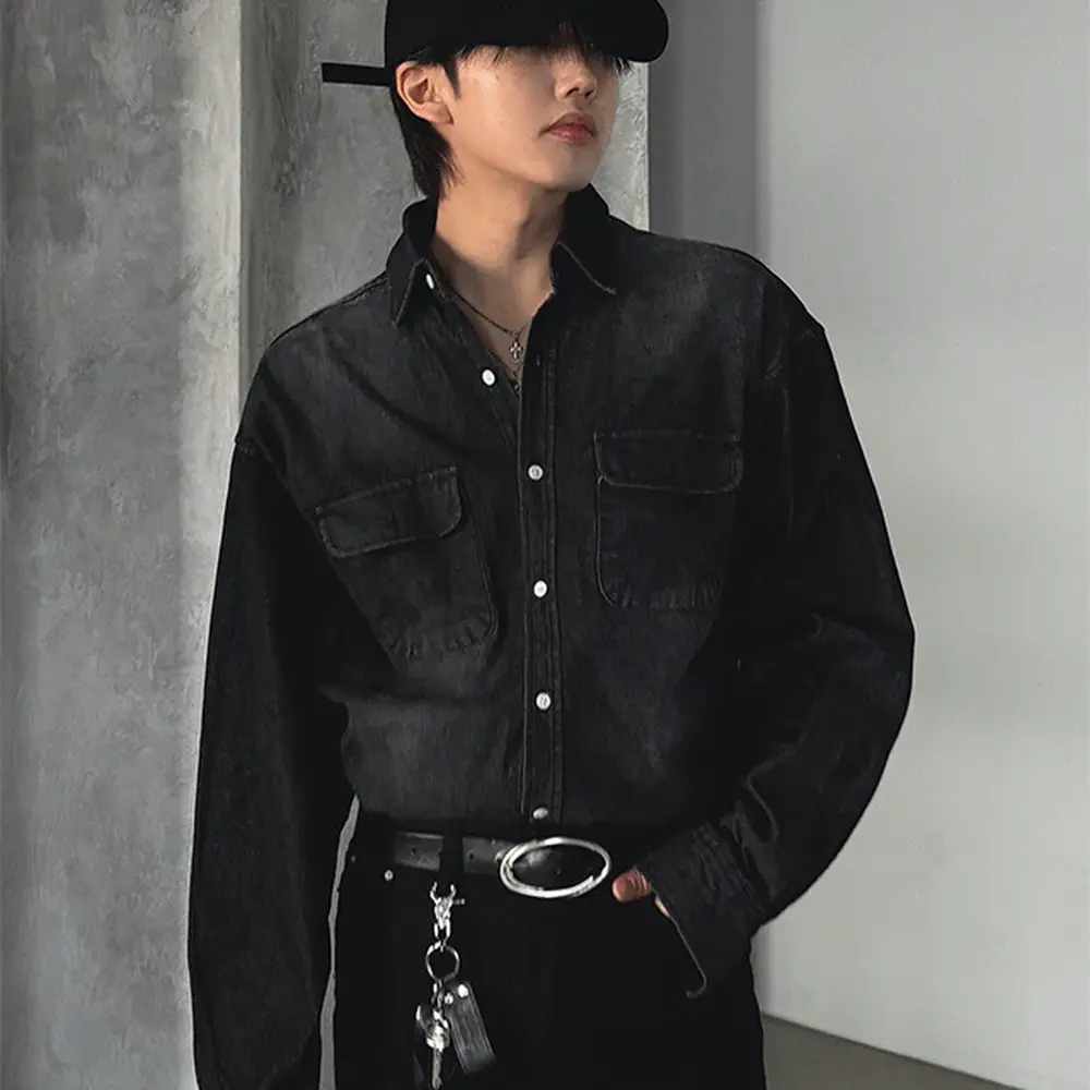韓国ライクに着こなすなら、同系色の黒デニムでセットアップ風にスタイリングしてみて。オールブラックで統一感を出しつつ、デニムならではのラフなムードで抜け感のある韓国コーデに仕上がります。