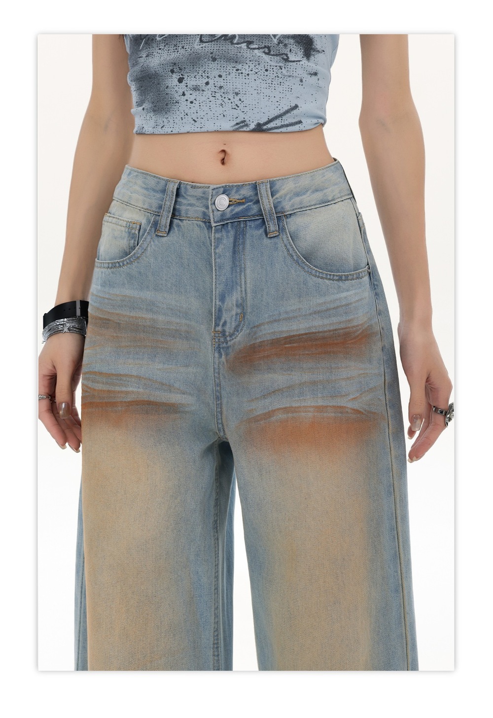 ライトブルーグラディエントウォッシュドストレートレッグフロアレングスジーンズ