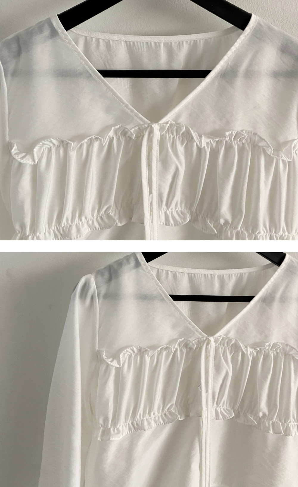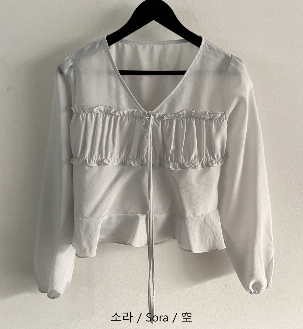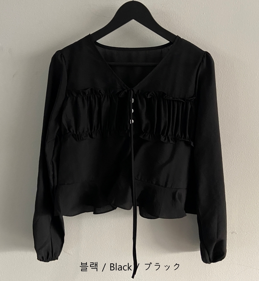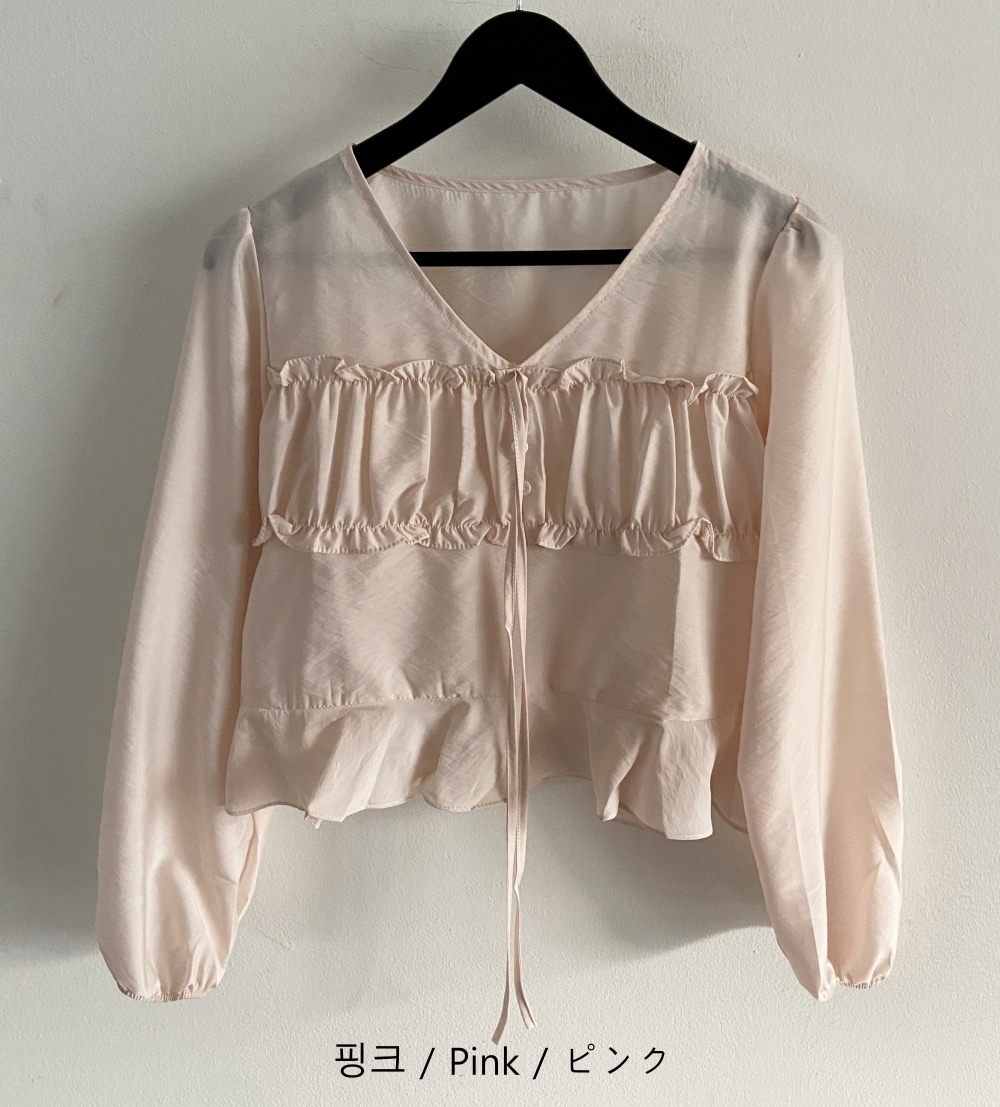 パンプキンシャーリングリボンVネックシースルー長袖レイヤードブラウス 4 colors
